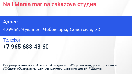 Nail Mania & marina.zakazova, студия по адресу 429956, Чувашия, Чебоксары, Советская, 73 в дальнейшем Организация, размещена в следующих категориях: