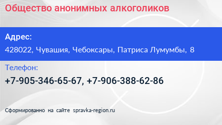 Общество анонимных алкоголиков по адресу 428022, Чувашия, Чебоксары, Патриса Лумумбы, 8 в дальнейшем Организация, размещена в следующих категориях: