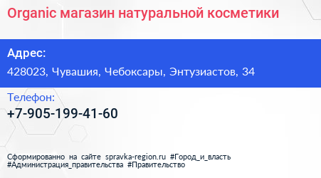 Organic, магазин натуральной косметики по адресу 428023, Чувашия, Чебоксары, Энтузиастов, 34 в дальнейшем Организация, размещена в следующих категориях: