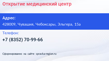 Открытие, медицинский центр по адресу 428009, Чувашия, Чебоксары, Эльгера, 15а в дальнейшем Организация, размещена в следующих категориях: