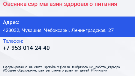 Овсянка, сэр, магазин здорового питания по адресу 428032, Чувашия, Чебоксары, Ленинградская, 27 в дальнейшем Организация, размещена в следующих категориях:
