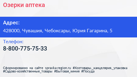 Озерки, аптека по адресу 428000, Чувашия, Чебоксары, Юрия Гагарина, 5 в дальнейшем Организация, размещена в следующих категориях:
