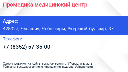 Промедика, медицинский центр по адресу 428027, Чувашия, Чебоксары, Эгерский бульвар, 37 в дальнейшем Организация, размещена в следующих категориях: