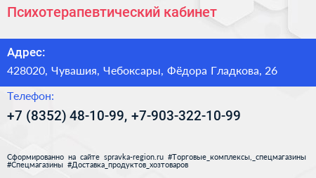Психотерапевтический кабинет по адресу 428020, Чувашия, Чебоксары, Фёдора Гладкова, 26 в дальнейшем Организация, размещена в следующих категориях: