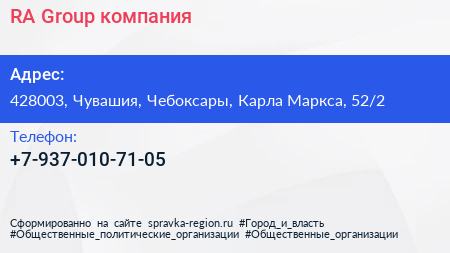 RA Group, компания по адресу 428003, Чувашия, Чебоксары, Карла Маркса, 52/2 в дальнейшем Организация, размещена в следующих категориях: