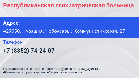 Республиканская психиатрическая больница по адресу 429950, Чувашия, Чебоксары, Коммунистическая, 27 в дальнейшем Организация, размещена в следующих категориях:
