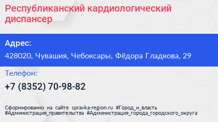Республиканский кардиологический диспансер по адресу 428020, Чувашия, Чебоксары, Фёдора Гладкова, 29 в дальнейшем Организация, размещена в следующих категориях: