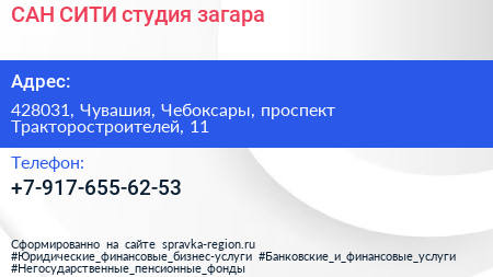 САН-СИТИ, студия загара по адресу 428031, Чувашия, Чебоксары, проспект Тракторостроителей, 11 в дальнейшем Организация, размещена в следующих категориях: