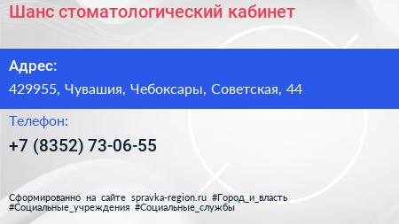 Шанс, стоматологический кабинет по адресу 429955, Чувашия, Чебоксары, Советская, 44 в дальнейшем Организация, размещена в следующих категориях: