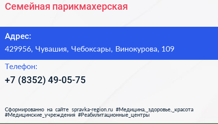 Семейная, парикмахерская по адресу 429956, Чувашия, Чебоксары, Винокурова, 109 в дальнейшем Организация, размещена в следующих категориях: