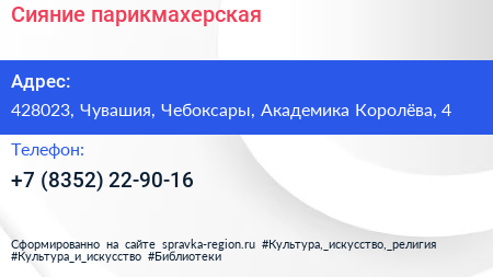 Сияние, парикмахерская по адресу 428023, Чувашия, Чебоксары, Академика Королёва, 4 в дальнейшем Организация, размещена в следующих категориях: