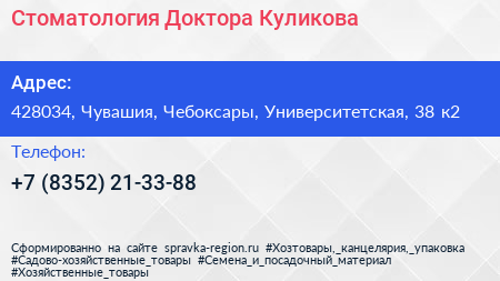Стоматология Доктора Куликова по адресу 428034, Чувашия, Чебоксары, Университетская, 38 к2 в дальнейшем Организация, размещена в следующих категориях: