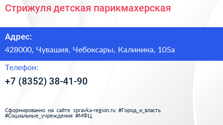 Стрижуля, детская парикмахерская по адресу 428000, Чувашия, Чебоксары, Калинина, 105а в дальнейшем Организация, размещена в следующих категориях: