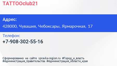TATTOOclub21 по адресу 428000, Чувашия, Чебоксары, Ярмарочная, 17 в дальнейшем Организация, размещена в следующих категориях: