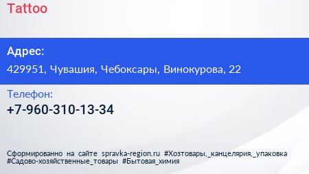 Tattoo по адресу 429951, Чувашия, Чебоксары, Винокурова, 22 в дальнейшем Организация, размещена в следующих категориях: