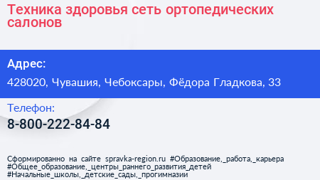 Техника здоровья, сеть ортопедических салонов по адресу 428020, Чувашия, Чебоксары, Фёдора Гладкова, 33 в дальнейшем Организация, размещена в следующих категориях: