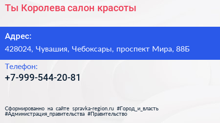 Ты-Королева, салон красоты по адресу 428024, Чувашия, Чебоксары, проспект Мира, 88Б в дальнейшем Организация, размещена в следующих категориях: