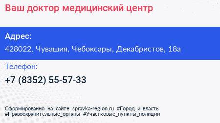 Ваш доктор, медицинский центр по адресу 428022, Чувашия, Чебоксары, Декабристов, 18а в дальнейшем Организация, размещена в следующих категориях: