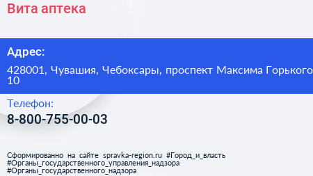 Вита, аптека по адресу 428001, Чувашия, Чебоксары, проспект Максима Горького, 10 в дальнейшем Организация, размещена в следующих категориях: