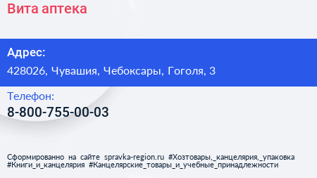 Вита, аптека по адресу 428026, Чувашия, Чебоксары, Гоголя, 3 в дальнейшем Организация, размещена в следующих категориях:
