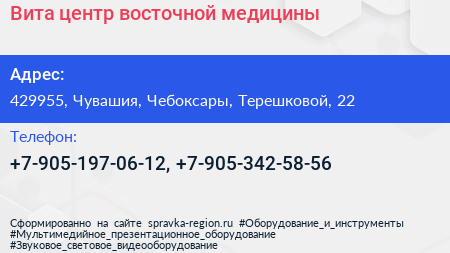 Вита, центр восточной медицины по адресу 429955, Чувашия, Чебоксары, Терешковой, 22 в дальнейшем Организация, размещена в следующих категориях: