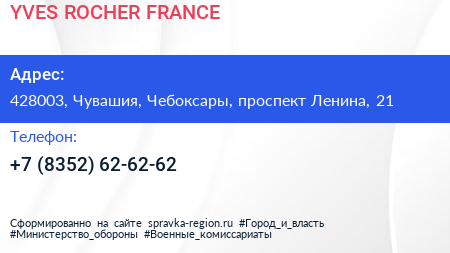 YVES ROCHER FRANCE по адресу 428003, Чувашия, Чебоксары, проспект Ленина, 21 в дальнейшем Организация, размещена в следующих категориях: