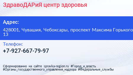 ЗдравоДАРиЯ, центр здоровья по адресу 428001, Чувашия, Чебоксары, проспект Максима Горького, 13 в дальнейшем Организация, размещена в следующих категориях: