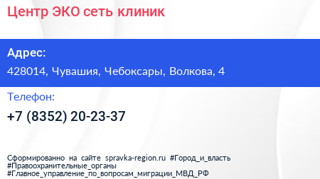 Центр ЭКО, сеть клиник по адресу 428014, Чувашия, Чебоксары, Волкова, 4 в дальнейшем Организация, размещена в следующих категориях: