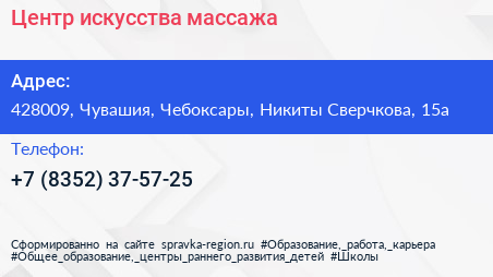 Центр искусства массажа по адресу 428009, Чувашия, Чебоксары, Никиты Сверчкова, 15а в дальнейшем Организация, размещена в следующих категориях: