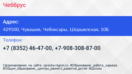 Чеббрус по адресу 429500, Чувашия, Чебоксары, Шоршелская, 10Б в дальнейшем Организация, размещена в следующих категориях: