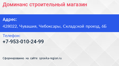 Доминанс, строительный магазин по адресу 428022, Чувашия, Чебоксары, Складской проезд, 6Б в дальнейшем Организация, размещена в следующих категориях: