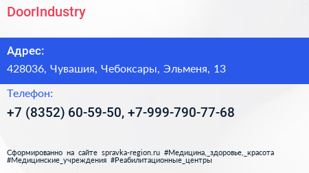 DoorIndustry по адресу 428036, Чувашия, Чебоксары, Эльменя, 13 в дальнейшем Организация, размещена в следующих категориях: