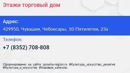 Этажи, торговый дом по адресу 429950, Чувашия, Чебоксары, 10 Пятилетки, 23а в дальнейшем Организация, размещена в следующих категориях: