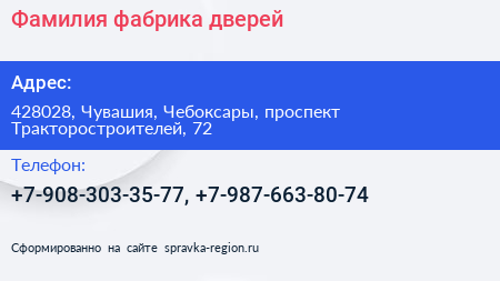 Фамилия, фабрика дверей по адресу 428028, Чувашия, Чебоксары, проспект Тракторостроителей, 72 в дальнейшем Организация, размещена в следующих категориях: