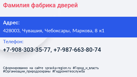 Фамилия, фабрика дверей по адресу 428003, Чувашия, Чебоксары, Маркова, 8 к1 в дальнейшем Организация, размещена в следующих категориях: