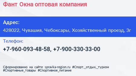 Фант Окна, оптовая компания по адресу 428022, Чувашия, Чебоксары, Хозяйственный проезд, 3г в дальнейшем Организация, размещена в следующих категориях:
