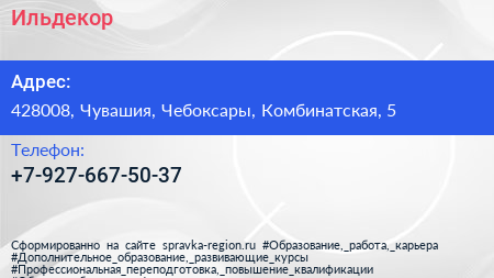 Ильдекор по адресу 428008, Чувашия, Чебоксары, Комбинатская, 5 в дальнейшем Организация, размещена в следующих категориях:
