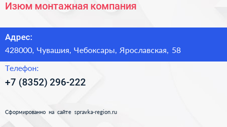 Изюм, монтажная компания по адресу 428000, Чувашия, Чебоксары, Ярославская, 58 в дальнейшем Организация, размещена в следующих категориях: