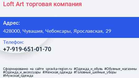 Loft Art, торговая компания по адресу 428000, Чувашия, Чебоксары, Ярославская, 29 в дальнейшем Организация, размещена в следующих категориях: