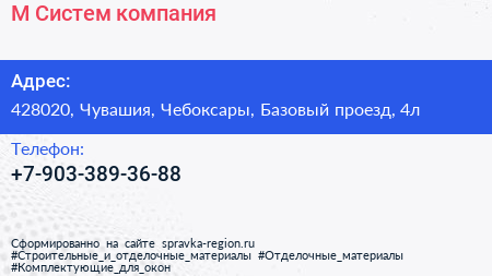 М-Систем, компания по адресу 428020, Чувашия, Чебоксары, Базовый проезд, 4л в дальнейшем Организация, размещена в следующих категориях: