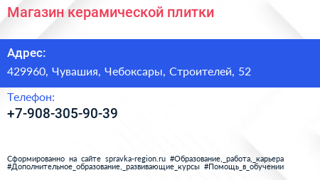 Магазин керамической плитки по адресу 429960, Чувашия, Чебоксары, Строителей, 52 в дальнейшем Организация, размещена в следующих категориях: