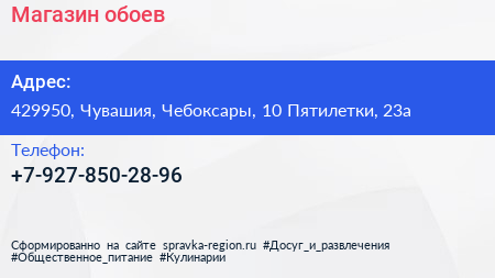 Магазин обоев по адресу 429950, Чувашия, Чебоксары, 10 Пятилетки, 23а в дальнейшем Организация, размещена в следующих категориях: