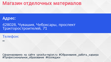 Магазин отделочных материалов по адресу 428028, Чувашия, Чебоксары, проспект Тракторостроителей, 71 в дальнейшем Организация, размещена в следующих категориях: