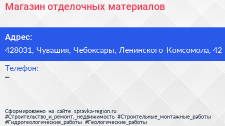 Магазин отделочных материалов по адресу 428031, Чувашия, Чебоксары, Ленинского Комсомола, 42 в дальнейшем Организация, размещена в следующих категориях: