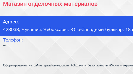 Магазин отделочных материалов по адресу 428038, Чувашия, Чебоксары, Юго-Западный бульвар, 18а в дальнейшем Организация, размещена в следующих категориях: