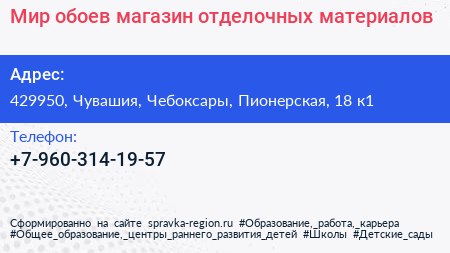 Мир обоев, магазин отделочных материалов по адресу 429950, Чувашия, Чебоксары, Пионерская, 18 к1 в дальнейшем Организация, размещена в следующих категориях: