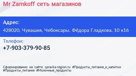 Mr.Zamkoff, сеть магазинов по адресу 428020, Чувашия, Чебоксары, Фёдора Гладкова, 10 к16 в дальнейшем Организация, размещена в следующих категориях: