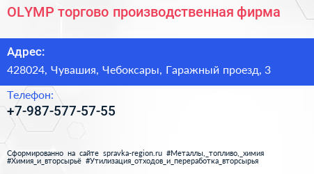 OLYMP, торгово-производственная фирма по адресу 428024, Чувашия, Чебоксары, Гаражный проезд, 3 в дальнейшем Организация, размещена в следующих категориях: