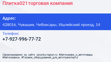 Плитка021, торговая компания по адресу 428016, Чувашия, Чебоксары, Ишлейский проезд, 14 в дальнейшем Организация, размещена в следующих категориях:
