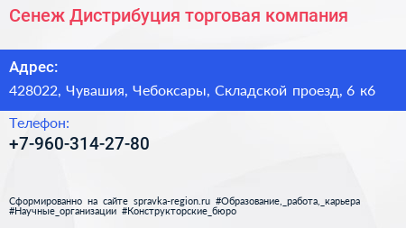 Сенеж-Дистрибуция, торговая компания по адресу 428022, Чувашия, Чебоксары, Складской проезд, 6 к6 в дальнейшем Организация, размещена в следующих категориях: